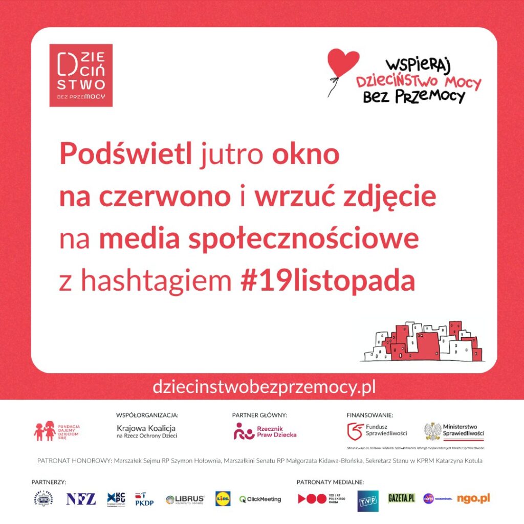 19 listopada, w Międzynarodowym Dniu Przeciwdziałania Przemocy Wobec Dzieci, odbędzie się finał ogólnopolskiej kampanii „Dzieciństwo bez przemocy”. Jej celem jest zwrócenie uwagi na problem krzywdzenia najmłodszych oraz mobilizowanie całego społeczeństwa do aktywnego przeciwdziałania przemocy wobec dzieci.