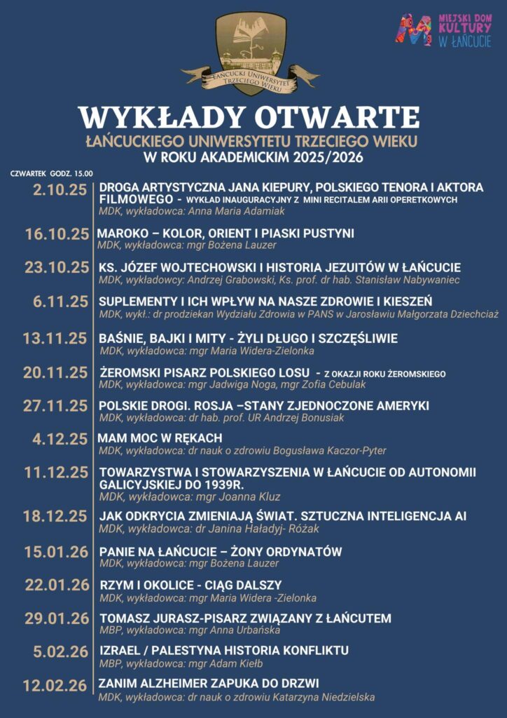 Wraz z inauguracją rozpocznie się nowy cykl wykładów otwartych, organizowanych w czwartki o godz. 15.00 w Miejskim Domu Kultury w Łańcucie.