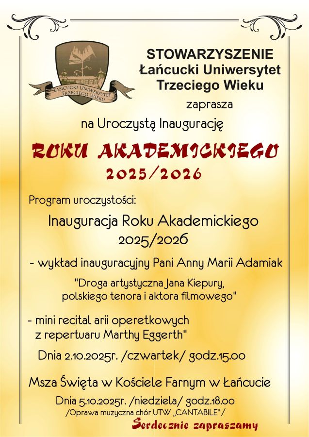Stowarzyszenie Łańcuckiego Uniwersytetu Trzeciego Wieku zaprasza na uroczystą inaugurację nowego roku akademickiego 2025/2026.