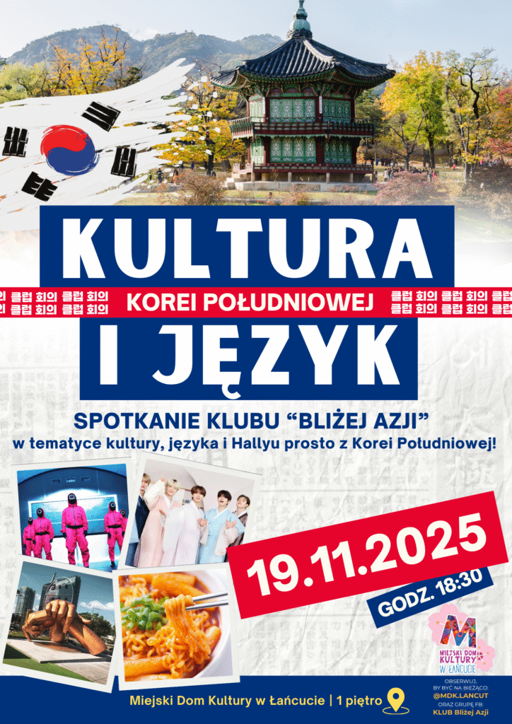 Już 19 listopada 2025 roku o godzinie 18:30 w Miejskim Domu Kultury w Łańcucie (I piętro) odbędzie się kolejne spotkanie w ramach Klubu „Bliżej Azji”, tym razem poświęcone Korei Południowej.