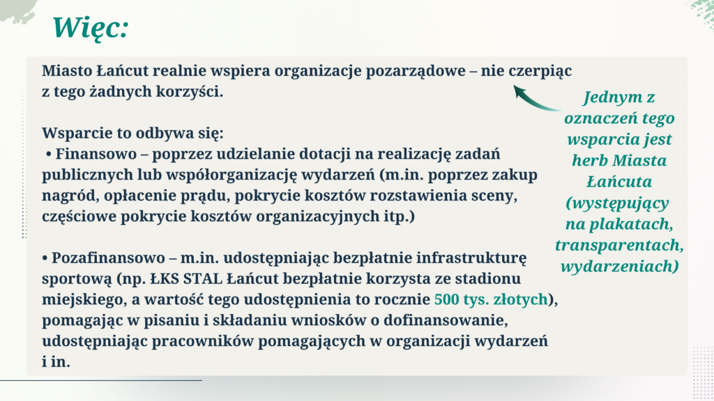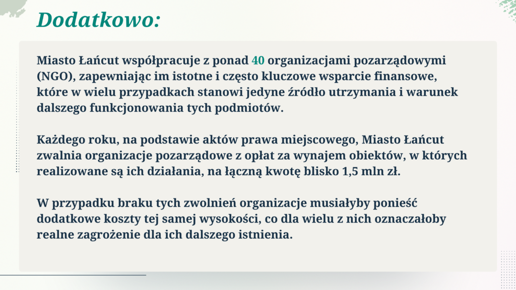 Corocznie zwalnia je z opłat za wynajem obiektów na kwotę blisko 1,5 mln zł, co w wielu przypadkach decyduje o ich dalszym funkcjonowaniu.