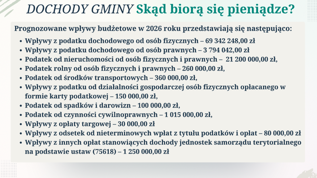 Budżet Miasta Łańcuta na 2026 rok opiera się na prognozowanych wpływach z kilku głównych źródeł. Największą część dochodów stanowią udziały w podatkach dochodowych oraz podatki lokalne.