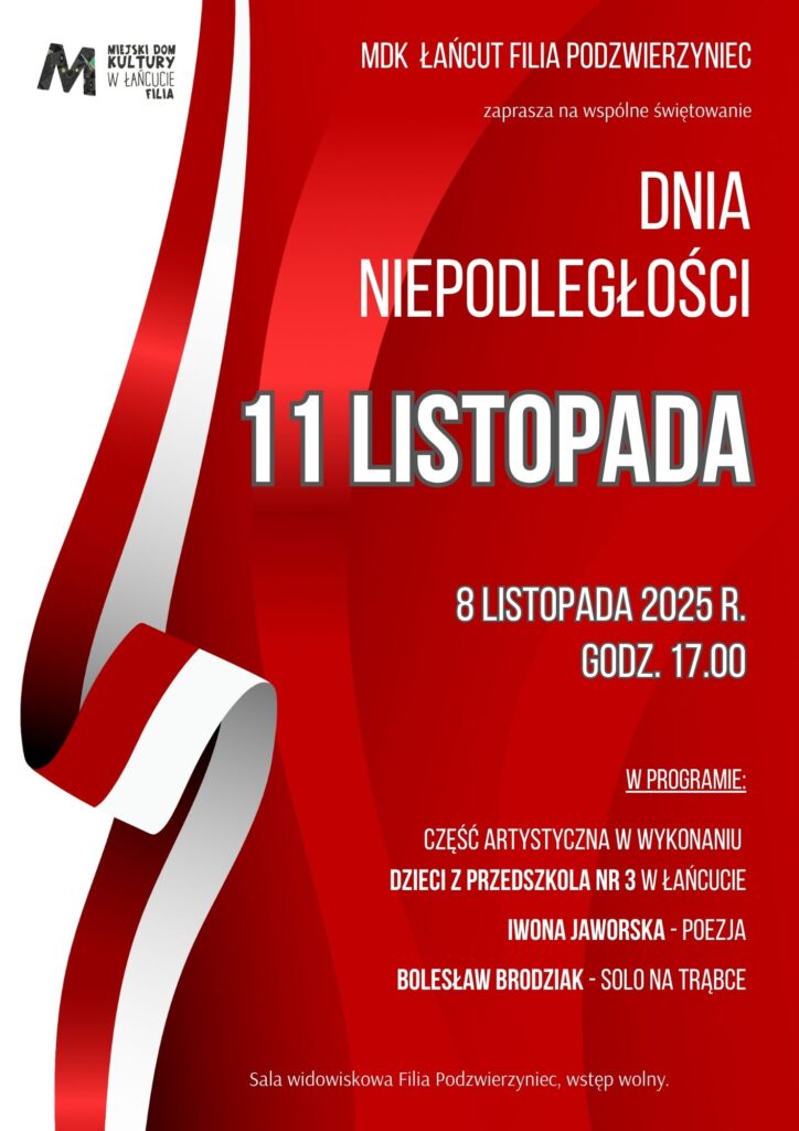 W tym roku uroczystości rozpoczną się już 8 listopada 2025 roku w Miejskim Domu Kultury – Filii Podzwierzyniec, gdzie o godz. 17:00 odbędzie się wyjątkowe spotkanie patriotyczne.