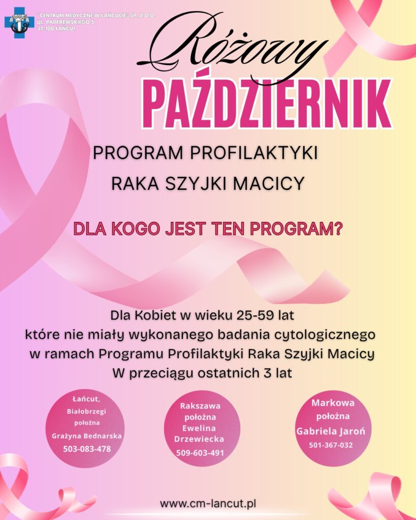 Październik to miesiąc troski o kobiece zdrowie – czas, w którym szczególną uwagę zwraca się na profilaktykę raka piersi i raka szyjki macicy. To właśnie teraz, w ramach akcji „Różowy Październik”, Centrum Medyczne w Łańcucie przypomina, jak ważne są regularne badania i profilaktyka.