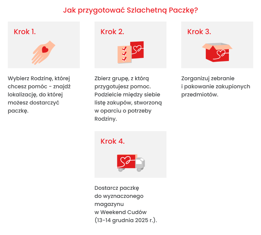 Dostarcz paczkę do wskazanego magazynu Po dokonaniu wyboru rodziny otrzymasz informacje o adresie magazynu oraz terminie — paczka musi tam trafić na czas. W razie wątpliwości skontaktuj się z opiekującym wolontariuszem.