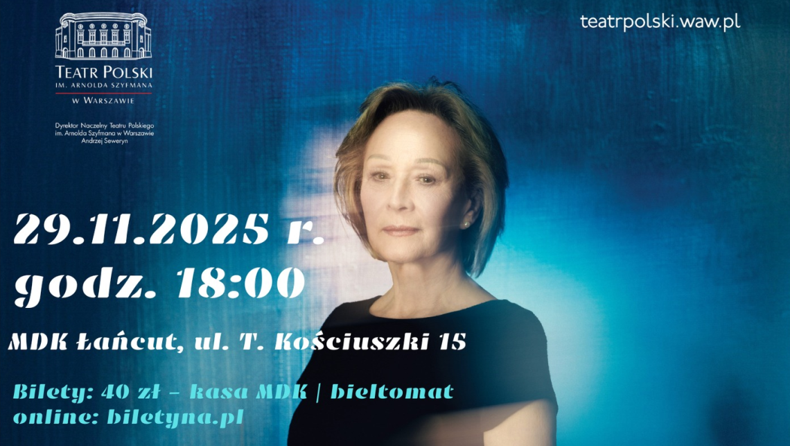 Już w sobotę, 29 listopada o godz. 18:00, w sali widowiskowej Miejskiego Domu Kultury w Łańcucie wystąpi jedna z najbardziej cenionych polskich aktorek – Grażyna Barszczewska. Artystka od lat zachwyca publiczność niezwykłą wrażliwością, elegancją sceniczną i wyjątkową interpretacją słowa.