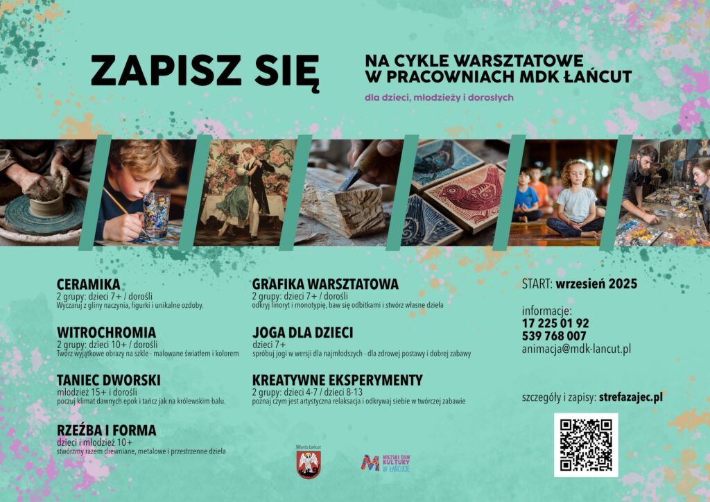 Miejski Dom Kultury w Łańcucie (ul. Kościuszki 15) ogłasza zapisy na cykle warsztatów dla dzieci, młodzieży i dorosłych. Zajęcia rozpoczną się we wrześniu 2025 roku.
