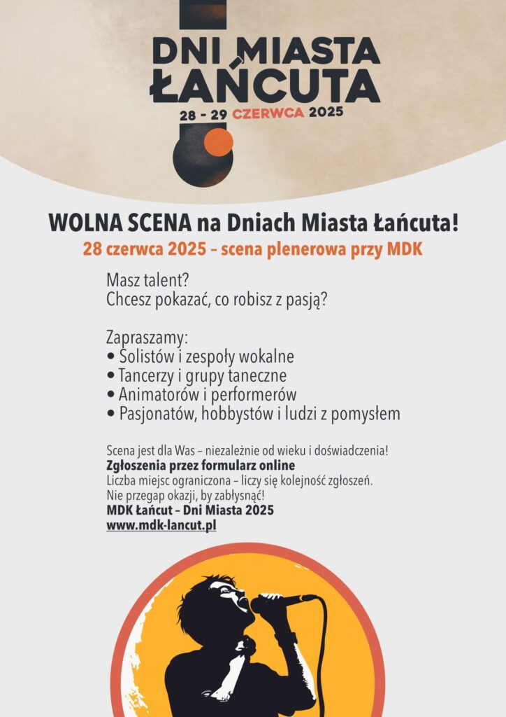 Miejski Dom Kultury w Łańcucie zaprasza do udziału w „Wolnej Scenie” – otwartej inicjatywie artystycznej organizowanej w ramach Dni Miasta Łańcuta. Wydarzenie odbędzie się 28 czerwca 2025 roku na scenie plenerowej przy MDK.