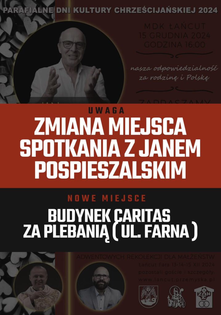 Z uwagi na duże zainteresowanie wydarzeniem z udziałem Jana Pospieszalskiego, znanego dziennikarza i publicysty, organizatorzy zdecydowali o zmianie miejsca spotkania, które z początku miało się odbyć w Galerii Miejskiego Domu Kultury w Łańcucie.